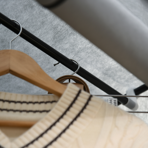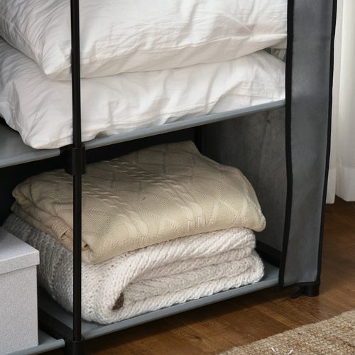 Multi-storage: A wardrobe with four shelves and a two hanging rails. This foldable wardrobe offers plenty of storage and hanging space for clothing, bedding, accessories and more.Temporary wardrobe design: Formed of a metal frame and a fabric cover, this portable closet wardrobe can be set up and taken down easily. Move it around and use wherever you need, anytime.Steel frame: Powder coated for extra strength, the metal forms a tough core for this fabric wardrobe - keeping stable when packed with clothing and more.Fabric cover, with roll-up doors: Panel pieces can be left down or held up - giving you easy access and keeping garments protected whenever needed.Dimensions: 170H x 118W x 49Dcm. Maximum load 70kg. Easy to assemble.